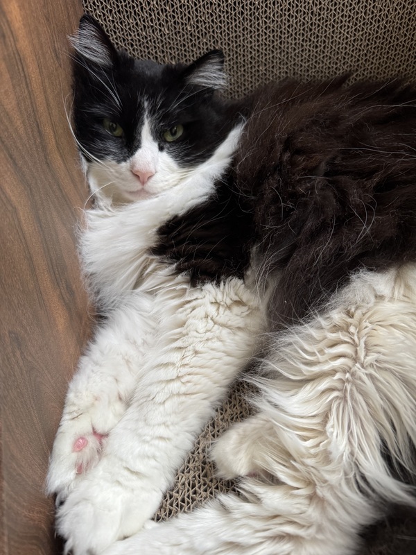 | 特徴(性格など) | 黒白もふもふ 落ち着きがありよく人を見ています。 甘えん坊な部分もあるツンデレさんで寝る時はお腹を出して寝ることもあります。 |