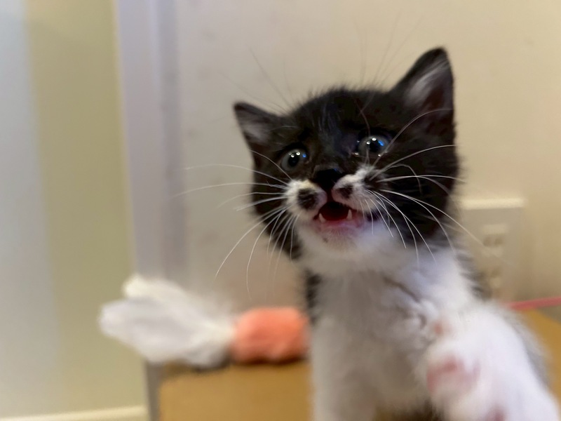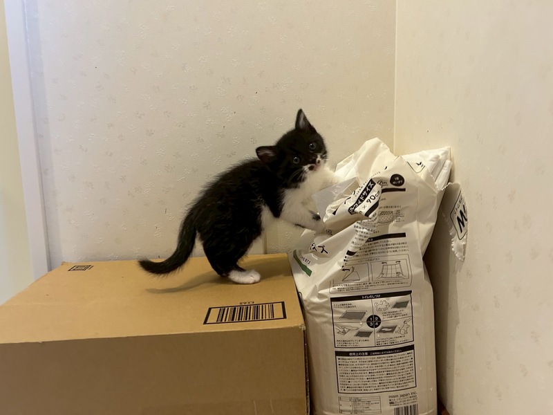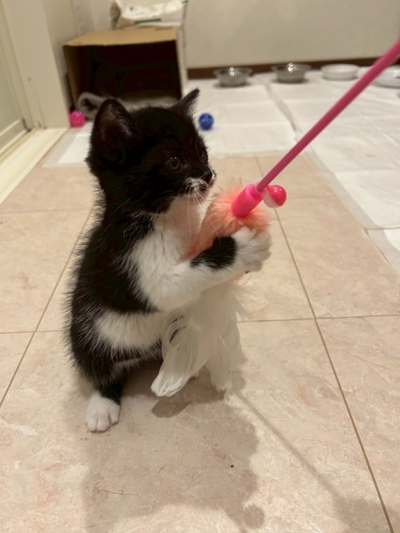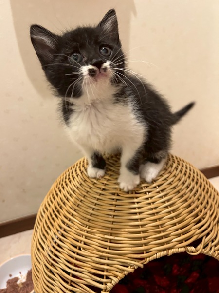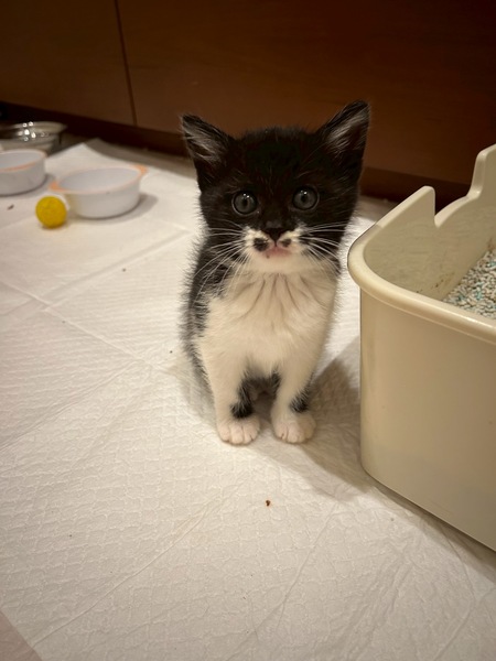 | 特徴(性格など) | 白黒柄の女の子です。人間と遊ぶのが大好きな甘えん坊さんです。食欲旺盛でウェットカリカリどちらも好んで食べてます。トイレは猫砂で上手にしてます。 | ||