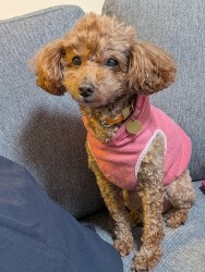 | 特徴(性格など) | ■特徴(仮の名前:イヴ) トイプードル♀茶 14歳(2011.12.17生) 4.5キロ ■性格・暮らし ・人のお膝が大好きな甘えん坊です。 ・先住犬とも全く問題なくマイペースに過ごせます。 ・身体はどこを触っても大丈夫です。 ・お散歩は大好きで上手に歩きます。 ・室内トイレはシートの認識がなく練習中です。 ・留守番、就寝はケージ内でお利口にできます。 ・来客に吠えることもなく、知らない人にもフレンドリーです。 ・車にもおとなしく乗っていられます。車酔いはありません。 ■実施済みの医療措置 ・混合ワクチン(6/7済申告あり) ・狂犬病予防ワクチン(6月済申告あり) ・保護時、避妊済み ・フィラリア陰性(12/11) ・血液検査・異常なし(12/11) ・検便・異常なし(12/11) ・マイクロチップ装着済み(12/11) ■今後実施予定の医療措置 特になし |