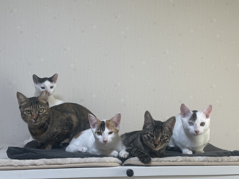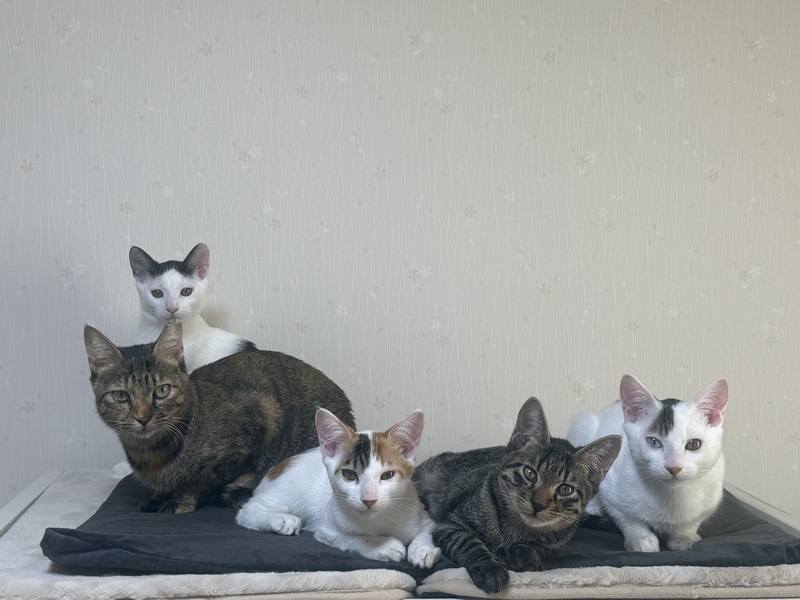 | 里親募集する理由 | 【保護の経緯】 エサやりをされている方から「子猫が産まれている」との連絡を受け、親子で保護しました。 【健康状態】 現在、健康状態は良好です。 エイズ・白血病、共に陰性。 各種駆虫済み。 それぞれに可愛い魅力があり、どの子も大切に育ててきました。 この子たちにずっとのお家と家族を見つけてあげたいと思っています。 気になる子がいましたら、お気軽にお問い合わせください。 |
