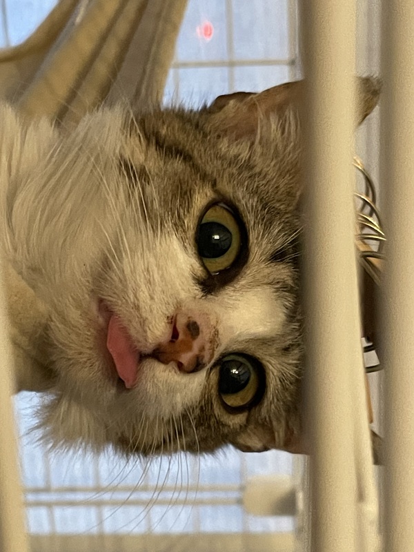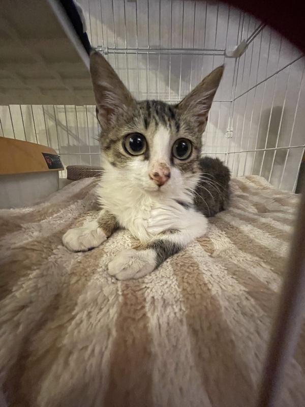 | 特徴(性格など) | キジ白の長毛ちゃん。 お目目くりっくりの美猫です。 とても大人しく、一日中ケージで過ごしてます。 保護当時、肺と胃、腸が癒着しており危険な状態でした。 手術を受け、今は遊ぶことが大好きな元気娘になりました。 |