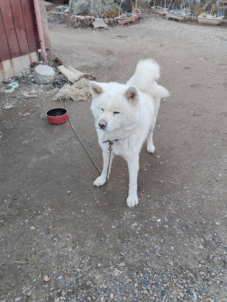 | 特徴(性格など) | 白色のオスの秋田犬です。 性格はとても大人しく、お利口で穏やかな子とのことです。 多頭飼いの経験はありません。 現在は外飼いで、敷地内には屋根付きの犬小屋(写真2・3枚目)が設置されています。 しっかりお世話やしつけができる方であれば、 室内飼いへのトレーニングも可能だと思われます。 最初は玄関での飼育からスタートするなど、段階的な移行が良いかと思います。 |