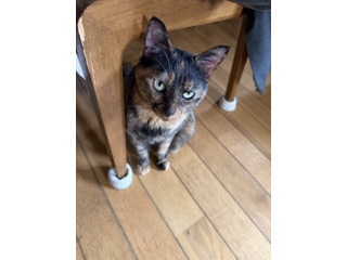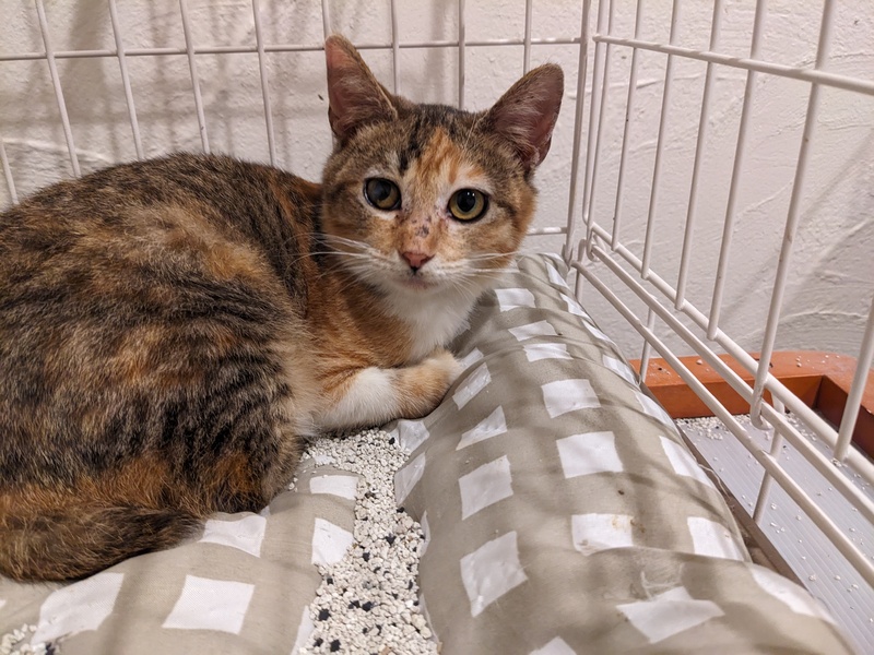 | 特徴(性格など) | サビ三毛猫 好奇心旺盛で遊び好き、マイペースだけど甘えん坊、典型的ツンデレです。 風邪の後遺症による右目角膜の傷跡が治癒途中でしばらくの間一日2回の点眼が必要です。 |