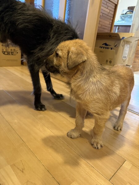 | 特徴(性格など) | すぐに協力の動物病院に通院したところ、後ろ足が立たない女の子は骨盤骨折。 そしてこの全身腫れている男の子は、かなり危険な状況とつげられました。 亡くなる可能性も高いから覚悟を、と告げられました。 抗生剤の注射と飲み薬。 あとはこの子の生命力にかけるしありませんでした。 幸いにも投薬が効き、食欲もあり、メキメキと回復。 元気ではつらつとしたいたずら好きで大胆な、 人懐こい子犬に変身しました。 野犬には珍しい陽キャ・・・裏を返せば、しっかりとしつけをしないと 増長していくタイプ。 非常に賢く、トイレの認識もあり、人や他の犬のことをよく観察した上で悪戯をするような いい意味でも悪い意味でも賢い犬となりそうです。 今まで保護したもさっとしたテリア風の長毛は珍しいのか、お散歩をしていても 方方から声をかけられる愛される犬が多いです。 外国の映画に出てきそうな犬といえばいいでしょうか。 足の大きさや成長スピードなどから、成犬時30キロ級の大きさになる可能性もあります。 家族全員できちんと向き合ってくださるご家庭に。 |