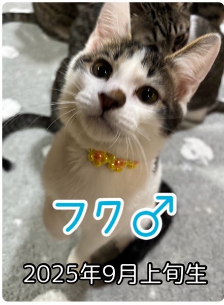 | 特徴(性格など) | キジシロ 6匹兄妹です。 甘えん坊で、食べるの大好き 兄弟のシンとは特に一緒にいることか多いです。 エイズ・白血病、共に陰性 |