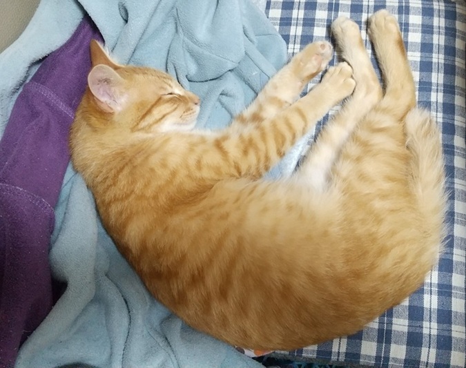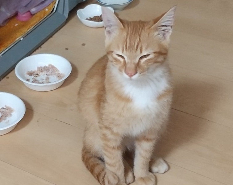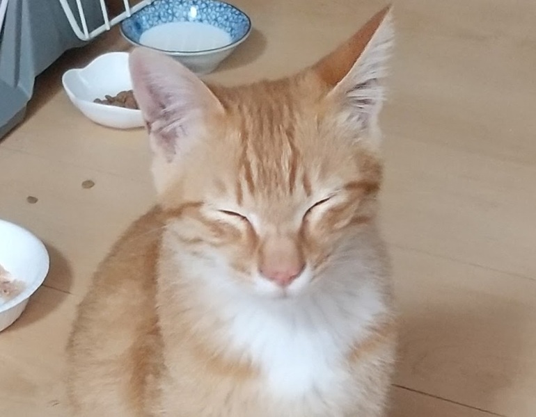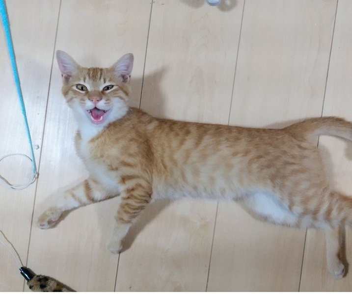 | 特徴(性格など) | 元気な茶トラの男の子(推定6.5か月)。 よく遊び、よく食べてよく甘えます。人間の膝でくつろぐのが大好きです。 自分から膝に飛び乗ってきます。抱っこも好き。 抱っこすると、明るい茶色の瞳でじっと私の顔を見つめます。 (どんな経緯で迷い込んできたのかわかりませんが、もう独りぼっちは嫌だよ!と言っているみたいです。) 「ごはんちょうだい!」「膝にのせて!」「遊びたい」 鳴いてお願いを伝えてくる意思表示のはっきりした子です。 捕獲時には警戒心が強くて苦労しましたが、実は甘えん坊で人間大好きだったのです。 顔が小さく四肢が長く、なかなかいいスタイルです。 成猫になるとやや大きめの体格になりそうです。 保護してすぐは痩せていたので、最初に診察した獣医師には4か月くらいと言われましたが、1回目ワクチン接種時に別の医師に診てもらったところ、6.5か月にはなっているだろう、とのことで月齢を修正しました。 現在(3/5)の体重 3.6キロ 〇ウィルス検査: 済(エイズ/白血病 無) 〇寄生虫/蚤ダニ対策: ネクスガード滴下済 〇ワクチン接種: 1回目 済/ 2回目は3月末を予定 〇去勢手術: 未 4月初旬を予定 |