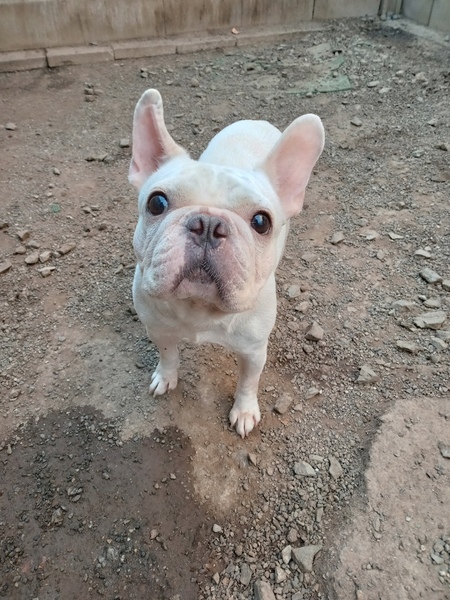 | 特徴(性格など) | ほぼ白一色です。 フレンチとしては大人しい方だと思います。 私の後をついてくるとても人懐こい子です。 多出産の為か乳首が肥大していますが、腫瘍などではないようです。 ほとんど吠えません。 室内トイレや散歩はトレーニングが必要です。 留守番、就寝中はケージで大人しくしています。 他の子とも仲良くできます。 快食快便、毎日元気に走り回っています。 引取時食欲がなく陰部から出血が見られたため、検査治療を行いました。 この犬種に多い皮膚疾患、眼疾患、呼吸器疾患は現在見受けられません。 保護犬ですので、過度に健康問題を気にされる方はご遠慮ください。 |