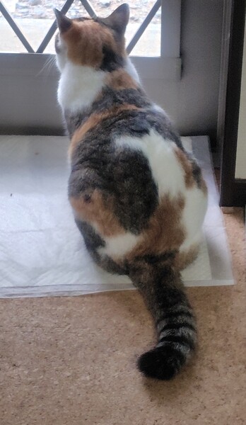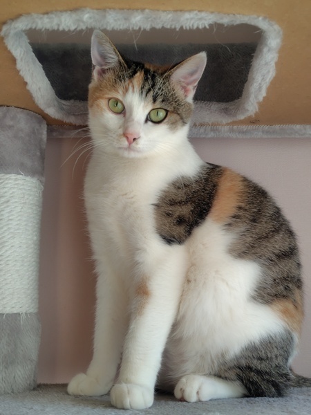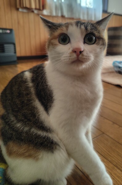 | 特徴(性格など) | 凄く元気なしま三毛猫です!先住猫にも積極的に絡むので先住猫がタジタジです。猫には物怖じしない性格ですが、人慣れはしていません。保護してまだ3ヶ月少しなので慣れていませんが、気が向くと足元にスリスリしますが触ろうとしたり、接近すると逃げます。人慣れにはちょっと時間がかかりそうです。 | ||