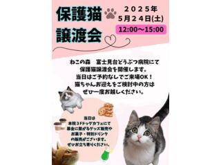 ~ねこの森 富士見台どうぶつ病院について~ 獣医師監修のもと、保護猫たちの新しい家族との出会いをサポートする動物病院併設の保護猫施設です。一般診療から最新のFIP治療まで、充実した医療体制で保護猫たちの健康を支えています。 【施設案内】 住所:東京都中野区上鷺宮4-15-7 電話:03-3825-1111 ◆営業時間 富士見台どうぶつ病院 午前:9:00~12:00 午後:16:00~19:00 ※木曜定休 ねこの森(猫専用病院) 午前:9:00~12:00 午後:15:00~18:00 ※診療日:月・火・土 【保護猫との出会い方】 ・見学予約:木曜日(定休日)以外の12:00~16:00 お電話・受付にて予約受付中(当日予約可能) ・譲渡会:2ヶ月に1回開催(予約不要) ・YouTubeライブ配信:保護猫ルームの様子をリアルタイムで配信中!まずはここで猫ちゃんたちを見に来てね! 主な活動 ・保護猫見学会 ・獣医師による24時間健康管理 ・FIPオンライン相談 ・メディカルトリミング ・保護猫のケアとサポート ・チャリティーグッズ販売 詳しい情報は各種SNSでチェック! ▼公式サイト https://fujimidai-ac.com/ ・ねこの森 https://instagram.com/nekonomori2222/?next= ・富士見台どうぶつ病院 https://www.instagram.com/fujimidai_ah/?next= ▼YouTube https://youtube.com/channel/UCtM-h7mwQraxaT7-WIWC_lw?si=gyQFaZK5zpAJN8cY |