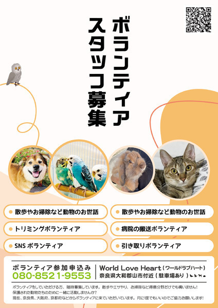 | 普段の活動内容・PRなど | world love heart(ワールドラブハート)は、奈良県大和郡山市で活動している動物保護団体です。 『引き取り依頼は断らない』をモットーに、犬、猫、鶏、小動物、家畜、爬虫類など捨てられた動物を保護しています。 ボランティアでは、10代から80代まで、幅広い年代の方が活躍中です! |