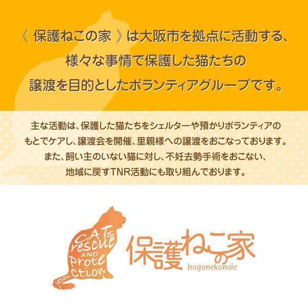 | 普段の活動内容・PRなど | 「保護ねこの家」は、大阪市を拠点に活動する、様々な事情で保護した猫たちの譲渡を目的とした動物愛護団体です。 主な活動は、保護した猫たちをシェルターや預かりボランティアのもとでケアし、譲渡会を開催、里親様への譲渡をおこなっています。 また、飼い主のいない猫に対し、不妊去勢手術をおこない、地域に戻すTNR活動にも取り組んでいます。 |