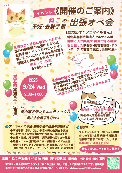 | 活動時間・日程など | 次回の猫の出張オペ会の当日の開催日時は2025年9月24日(水)9:00~19:00を予定しております。その間にご都合のよいお時間の間にお手伝いいただければ嬉しく思います。 また、前日の会場設営、後日の後片付けなどもお手伝いをお願いしたいです。さらに、猫を前日9月23日(火)午後12時から預かりますので、そのお世話などを前日、お世話いただけると助かります。お手伝いいただけるお時間などはご相談しながら調整いたしましょう! |