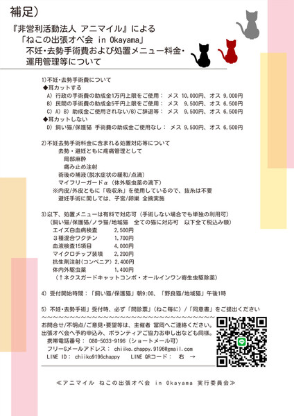 | 応募者様へのメッセージ | ねこの出張オペ会in岡山というイベントを定期開催しております。県外の獣医師(埼玉県川口市の動物病院の院長)=NPO法人(特定非営利活動法人)の代表でもある、また、理事、ボランティアスタッフの方々に県外から来ていただいて猫の不妊・去勢手術を行うイベントを行っております。様々な面でボランティアスタッフとしてお手伝いいただける方々を募集しております。 | ||