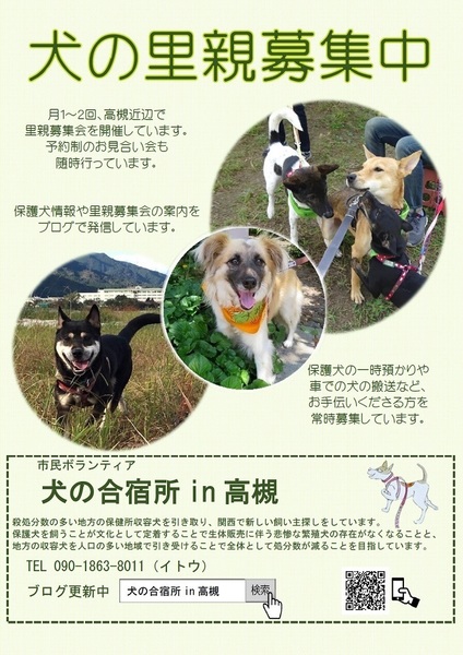 | 普段の活動内容・PRなど | 市民ボランティアグループ「犬の合宿所in高槻」は、殺処分数の多い離島の保健所収容犬を引き取り、 関西で新しい飼い主探しをしています。 保護犬を飼うことが文化として定着することで生体販売に伴う悲惨な繁殖犬を減らすことと、 地方の収容犬を人口の多い地域で引き受けることで全体として処分数が減ることを目指しています。 |