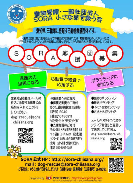 | 普段の活動内容・PRなど | 2004年から、生きたいと頑張っている小さな命を繋げることを第一に考え、センターからの保護・ケア・里親さん探しを中心とした動物保護・啓蒙活動を行っております。 【公式ホームページ】 https://sora-chiisana.org/ 【活動ブログ】 https://ameblo.jp/sora-chiisana-inochi/ |