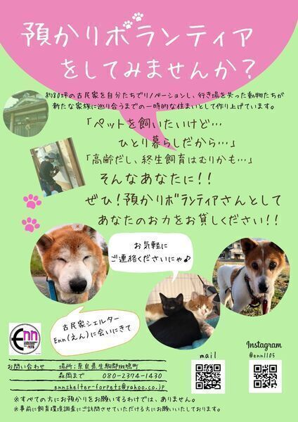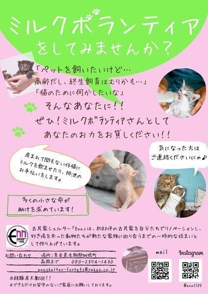 | 活動内容 | まだまだ始まったばかりの約80坪の古民家シェルター「Enn」で、 犬のお世話(ごはん、お散歩)や猫のお世話(ごはん、トイレ掃除、猫じゃらしで遊ぶ)など他にも あなたの特技を活かしたお手伝いボランティアさんを募集中!! また相性問題・感染症隔離などで、 収容数増加によりシェルターでの管理が困難になった時、 一時的にお手伝いいただく預かりボランティアさんも大募集中です。 そして 子猫の授乳、排泄のお手伝いなどの ミルクボランティアさんも大募集中です! 「お世話には行けないけど預かりならできる」と思ってくださるかたや お留守のある方、お一人暮らしの方、ご高齢の方も歓迎です。 駐車場もありますので お手伝いにきてくださいやすい環境です! |