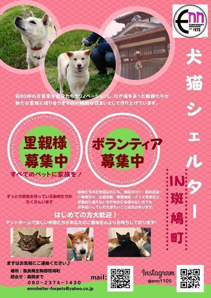 | 普段の活動内容・PRなど | 「Enn」は、虐待や飼育放棄など様々な事情で行き場を失った動物たちが新しい家族に巡り合うまでの一時的な住まいとして設立された施設です。 約80坪の古民家を自分たちの手でリノベーションし、動物たちが保護生活の期間を快適に過ごせるような環境作りに勤しんでいます。 |
